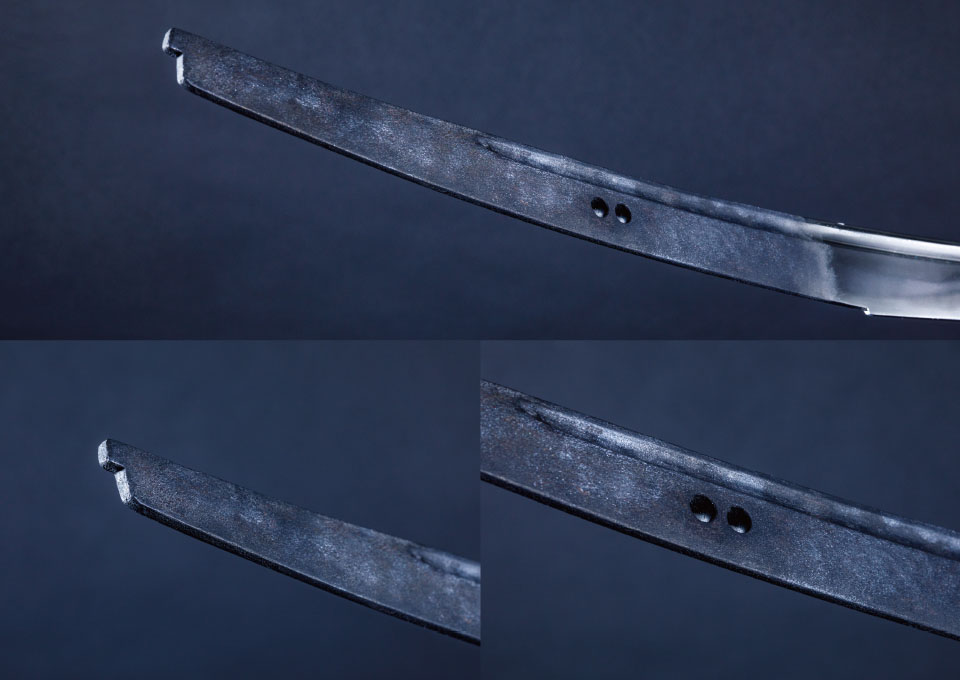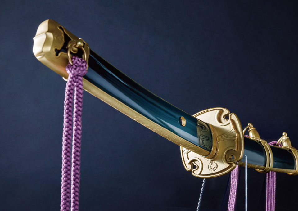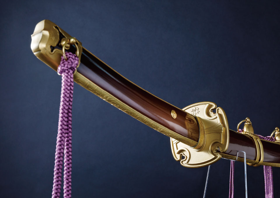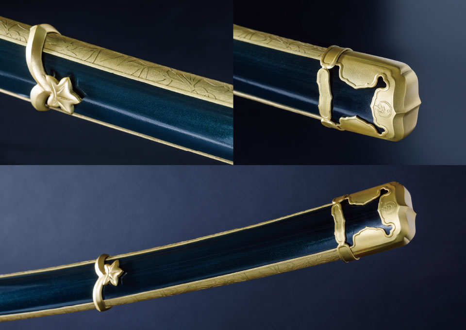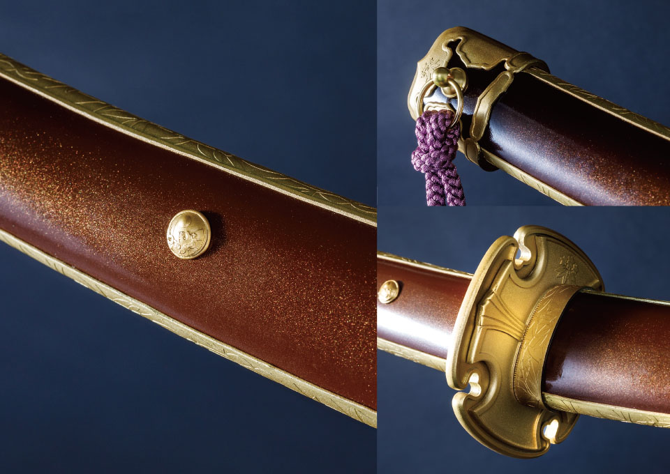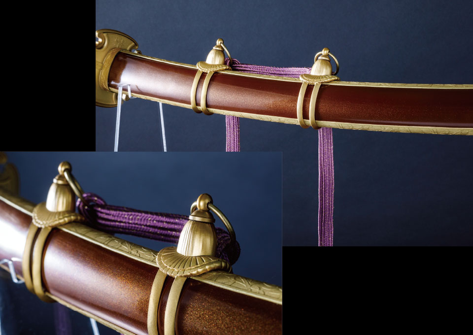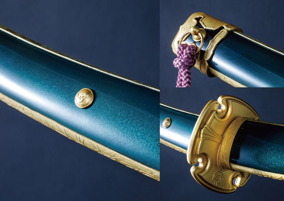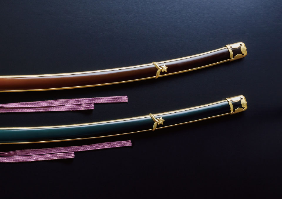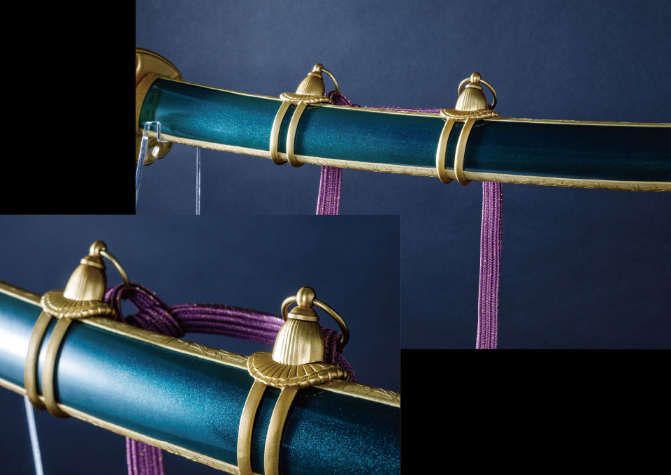 対して拵えは全く同じ見た目にすべく、二振りの刀身を内包した寸法にしています。柄や鞘の長さや目釘位置など、見た目に変わりはないですが、刀を納める中の空洞はそれぞれ異なり、抜刀してはじめて違いを感じられる仕様です。