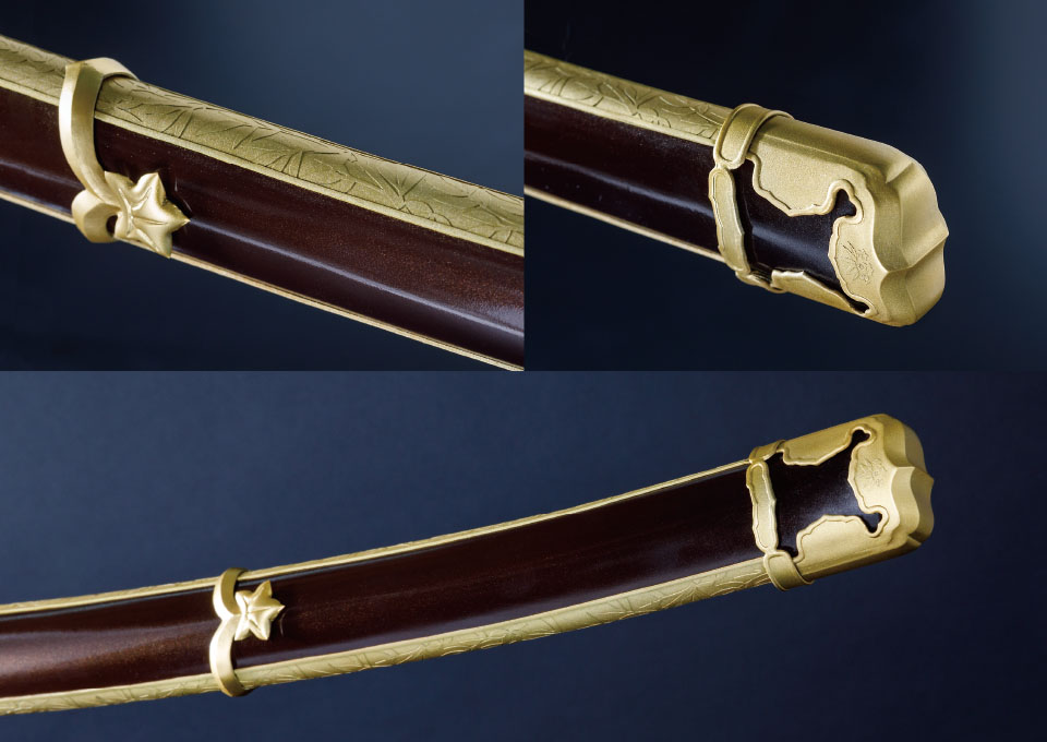 キャラクターデザイン上の拵えはシンプルな為、3次元へ落とし込むための改良が必要となり、現実にも設定にも違和感のない程度に意匠を変更しています。また、解像度を上げる程度の装飾を入れたので、シンプルながらも重厚感を感じれるようになっているかなと思います。